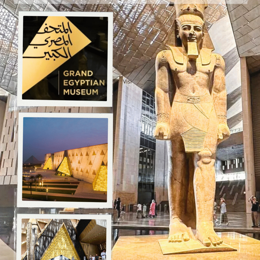 A selfie in front of Ramses will be automatically sent to your email. Visit and explanation of the Grand Staircase and its features. Panoramic view of the Giza Pyramids. Explanation of Tutankhamun and a suitable time to visit his galleries and their 5,380 artifacts. Historical exhibition halls classified chronologically and by type, showcasing the history of ancient Egypt from prehistoric times. Free time to explore the remaining halls and screens displaying various films. Meeting time: 10:00 AM. Egyptians must bring their national ID card, non-Egyptians their passport, and students must bring their student ID. Cameras are prohibited, but mobile phones are allowed. Food and drinks are prohibited, except for a small bottle of water. The tour is expected to end at 2:00 PM, but the free tour can be extended until the end of the day, depending on individual preference. The museum has a parking lot for 50 EGP, regardless of the number of hours parked. The museum is easily accessible by taxi, Uber, or public transport to Shooting Square. Ticket prices for Egyptians include admission, headphones, tour guide, and organization. (Adult) 425 EGP